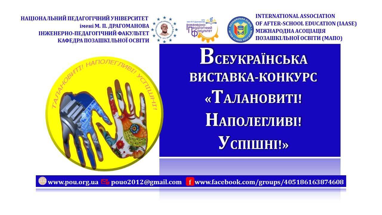 VІ Всеукраїнська онлайн виставка-конкурс «Талановиті! Наполегливі! Успішні!» – 2021 організована і проведена Національним педагогічним університетом імені М.П. Драгоманова, інженерно-педагогічним факультетом, кафедрою позашкільної освіти, науково-дослідною лабораторією позашкільної освіти спільно з Міжнародною асоціацією позашкільної освіти у період з 25.01.2021 р. по 01.03.2021 р.