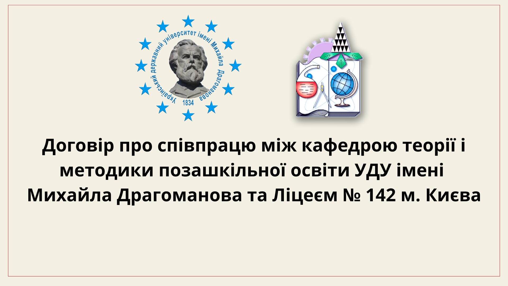 Підписано договір про співпрацю між кафедрою позашкільної освіти Українського державного університету імені Михайла Драгоманова та Ліцеєм № 142 м. Києва.