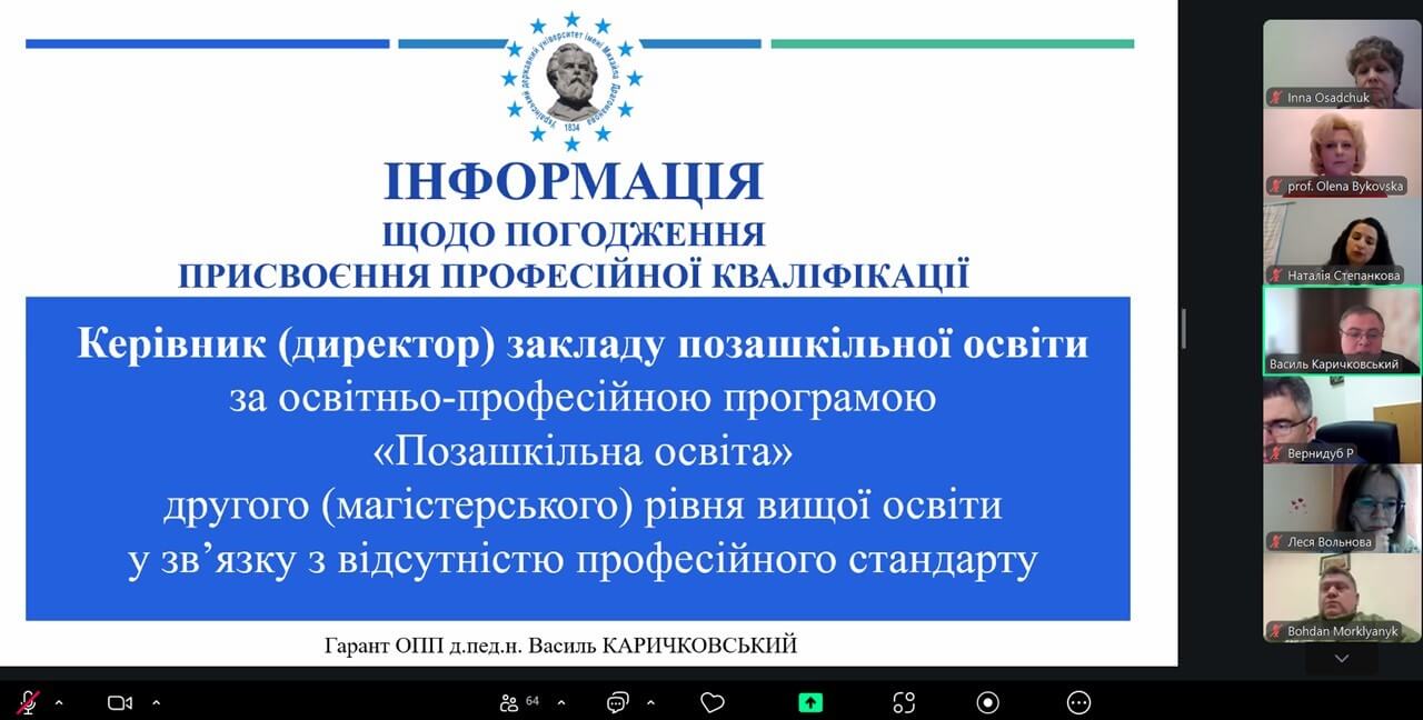 Гарант освітньої програми «Позашкільна освіта» професор Василь Каричковський презентував інформацію щодо присвоєння професійної кваліфікації «Керівник (директор) закладу позашкільної освіти». Зазначена кваліфікація відповідає професійній назві робіт, передбаченій Національним класифікатором професій ДК 003:2010.